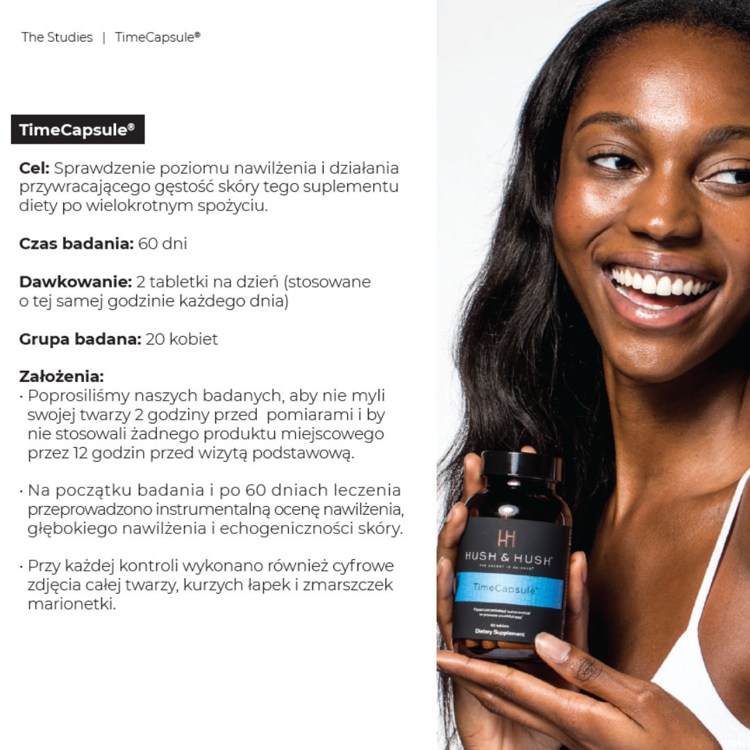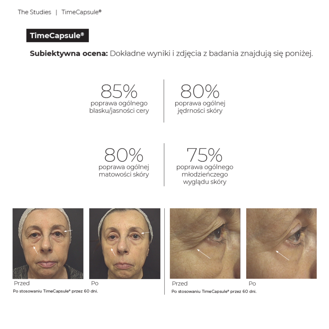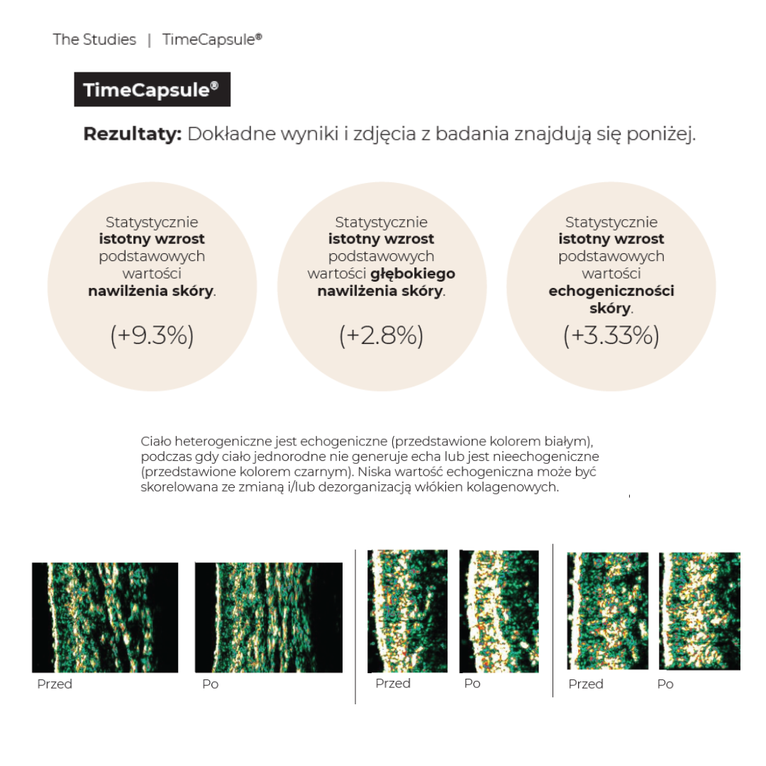 Koncentracja najważniejszych aminokwasów, witamin, antyoksydantów i adaptogenów pomaga zachować młodość skóry i włosów. Nutraceutyk TimeCapsule™ jest bardzo ważnym wsparciem w kuracjach zagęszczających skórę, niwelujących blizny, zmarszczki i cellulit. Może być stosowany w trakcie kuracji laseroterapią, mezoterapią, peelingami chemicznymi i technologią RF, które bardzo często powodują kontrolowany stan zapalny i zwiększają zapotrzebowanie na składniki odżywcze.